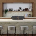 Een gesluierd oppervlak bestaande uit een ivoren basis gemengd met gewassen klei in een gedurfde en complexe metamorfe structuur, dicht doorkruist door brede aderen in houtskool en grijs die er als wolken overheen drijven met koperen accenten, waardoor de ondoorzichtige diepte van hard marmer ontstaat met de zachte doorschijnendheid van albast, in een Honed-afwerking.