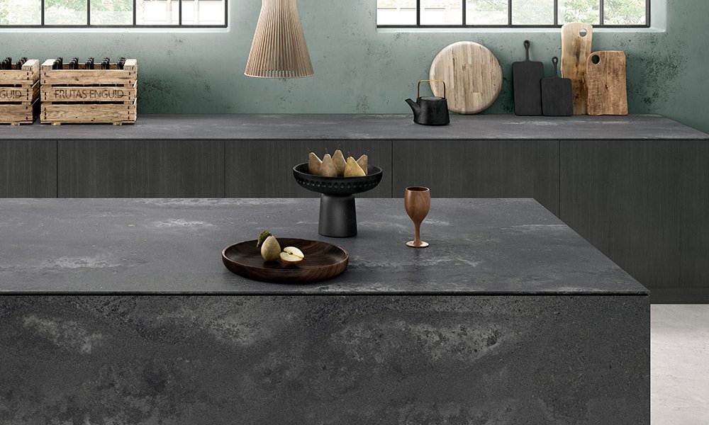 Mineraal werkbladen bieden ook duurzaamheid en weerstand in overvloed, waardoor ze een even praktische en stijlvolle optie zijn voor industriële keukens. Deze oppervlakken, zoals het warme en neutrale 4011 Cloudburst Concrete en de complexe en donkere gelaagdheid van 5810 Black Tempal, hebben vaak subtiele aders of ruwe, matte afwerkingen die naadloos aansluiten bij industriële designelementen.