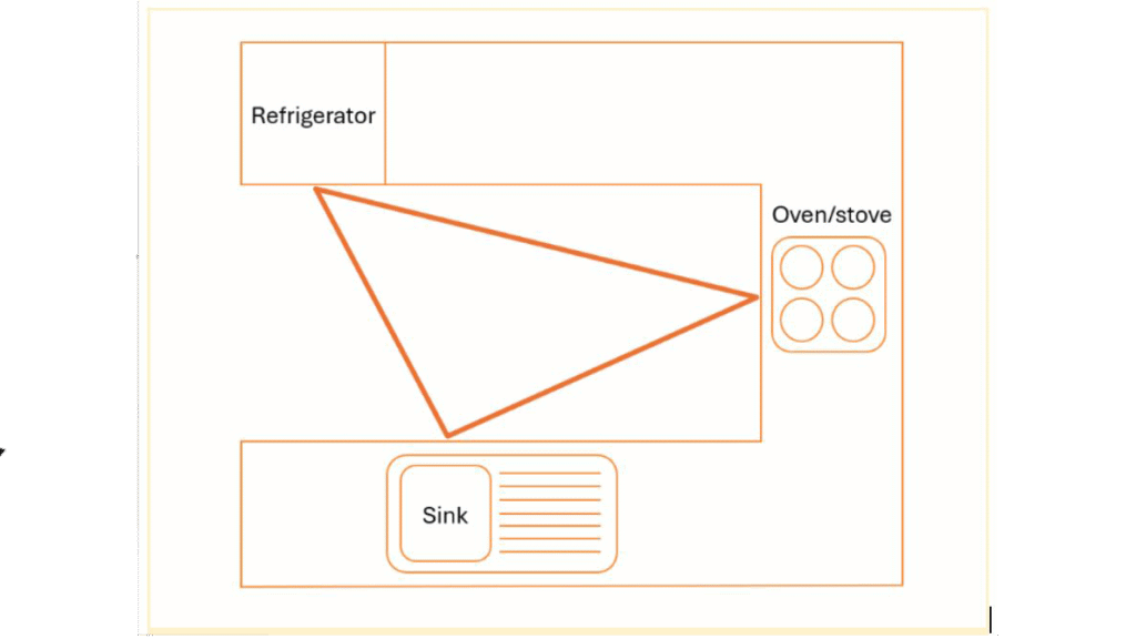 Dit ontwerp leent zich ook goed voor het ‘werkdriehoek’-concept, zelfs als een strikte driehoek niet altijd mogelijk is. Het doel is om uw fornuis, gootsteen en koelkast zo te plaatsen dat u zich op een ergonomische manier tussen deze belangrijke zones kunt bewegen. Dit maakt koken en bakken gemakkelijker, omdat uw belangrijkste apparaten en belangrijke lades en keukengerei binnen handbereik zijn. Zorg voor voldoende werkruimte tussen deze elementen om het bereiden en serveren van eten te vergemakkelijken.