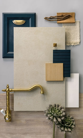 Een crème-beige achtergrond die de texturale aanwezigheid van verweerde stenen in evenwicht brengt, waarbij de oppervlakken in zachte lagen worden opgebouwd tot een natuurlijk en neutraal getint warm beton, in Ultra Rough-afwerking.