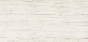 Een botwitte basis met terugkerende fijne grijze lijnen, doorkruist door dunne scheurtjes die doen denken aan de prehistorische uitstraling van gebarsten steen. Dit monochrome ontwerp weerkaatst het licht prachtig en creëert een elegante, eigentijdse look.