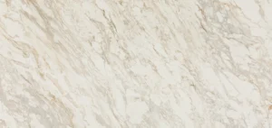 Een zachte witte basis met fijne lichtgrijze aders en koperaccenten die subtiel opgaan in de achtergrond, waardoor doorschijnende lagen ontstaan met een vloeiende kwaliteit en een zachte, rotsachtige beweging. Dit wordt ook nog eens versterkt door een luxueuze zijdeglans.