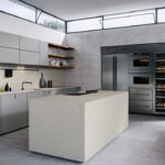 Een klassiek, neutraal gekleurd canvas verfraaid met onregelmatige schitteringen van zwart basalt en doorschijnend grijs, waarbij de speelsheid van terrazzo wordt gecombineerd met de robuustheid van beton.