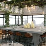 Een trendy stedelijke ruimte opent zich tussen het panoramische stadsbeeld buiten en het inspirerende interieur, met zijn minimalistische meubels te midden van blootgesteld ruw beton omringd door groen.