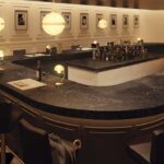 Een klassieke Engelse bar die een groot aantal details samenvoegt en een samenhangend beeld van rijkdom en verfijning vormt met de lijsten aan de muren, verlichtingsarmaturen, geruite vloer en dramatisch marmeren oppervlak om de ervaring compleet te maken.