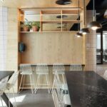 Scandinavische elementen kenmerken deze nauwkeurige en jeugdige ruimte, waar het natuurlijke zonlicht wordt gebruikt om de eenvoudige materialen te verlichten, waaronder het berkenhout en de witte 15x15 keramische tegels, naast tinten zwart, wit en grijs die mooi combineren met de vegetatie voor een extra vleug van natuurlijke kleur.
