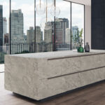 De bekleding van het eiland met een unieke tint en textuur komt overeen met het stedelijke landschap en completeert een modern minimalistisch beeld.