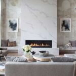 Een klassiek ontwerp met moderne lijnen, waardoor de spectaculair geaderde steen een hoofdrol speelt in de bekleding van de haard, met als resultaat een tijdloos warme en aangename ruimte.