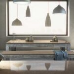 Deze minimalistische en enigszins ascetische ruimte is onconventioneel in zijn gebruik van meubilair en een dramatisch monochroom kleurenpalet, gecreëerd door de rijke combinatie van textuur en warme tinten, waaronder de paddenstoelachtige tinten van de stenen tafels die centraal staan.