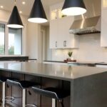 Deze moderne minimalistische ruimte contrasteert de ruwe, donkere steen met de gladheid van de witte kasten die worden benadrukt door stijlvolle hanglampen.