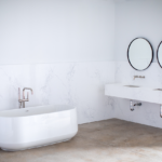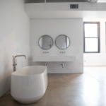 Swift Studios is een fotostudio in het hart van New York City. Deze badkamerapplicatie heeft een zwevend badmeubelconcept met 5151 Empira White als achterwand.