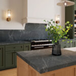 Donkere grijstinten vermengen zich met warmbruine accenten, in een ingewikkelde reeks die wordt versterkt door kleine vlekjes en oxidatie-effecten die de esthetische onzuiverheden van natuursteen weergeven, terwijl witte organische aderen gemengd met fijnere kalkachtige lijnen richting en dramatisch effect geven, in een Honed-afwerking.